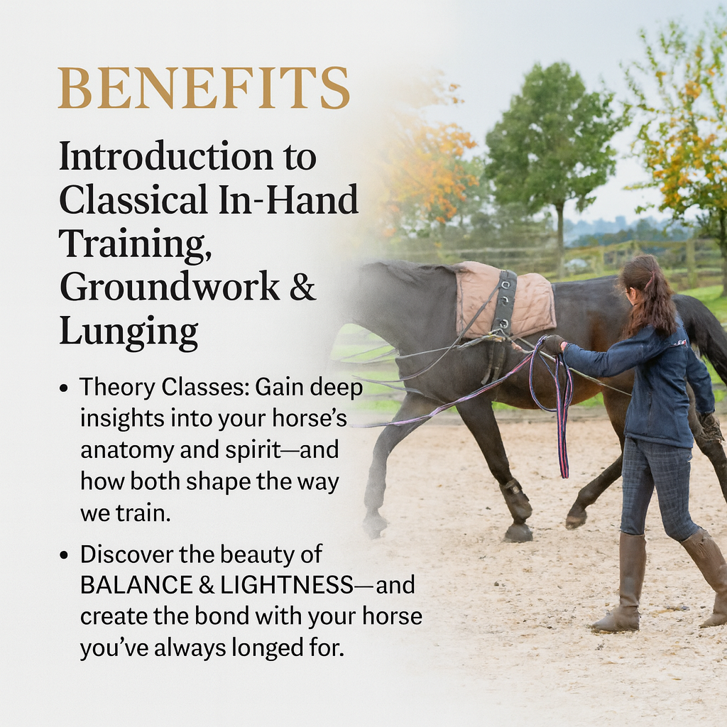 This course is designed for horse lovers, riders, and trainers who want to understand how to support their horse’s physical and mental development through thoughtful, biomechanically sound exercises done from the ground. You’ll learn how to guide your horse with precision and softness, using clear body language, proper positioning, and a focus on correct movement.